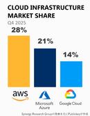 クラウドインフラのシェア、AWSがトップを維持するも28%、AzureとGoogle Cloudが少しずつ差を詰めていく。2025年第4四半期、Synergy Researchの調査結果